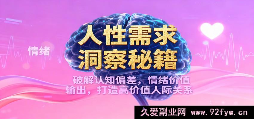 这是一门深度钻研人性需求洞察以及高价值人际关系搭建的课程。从人性哲学的维度去解读价值的本质,其根源在于需求的满足。课程全面且系统地讲述恐惧驱动、安全感循环、冷热价值辨别等关键理论,深入剖析人际认知的偏差以及共谋失败的困境,并提供需求判断的三大实用诀窍、低成本却能带来高回报的社交策略,还有情绪价值运用等实际操作方法,助力学员掌握深度共情能力,在人际关系中成为引领者。